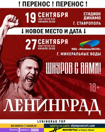 Шнуров с вами — ждём всех в новом месте и в новую дату! Билеты на танцпол действительны! Билеты на сидячие места подлежат замене по месту приобретения билетов согласно ценовой категории С 1 сентября доступна обмен и покупка билетов
